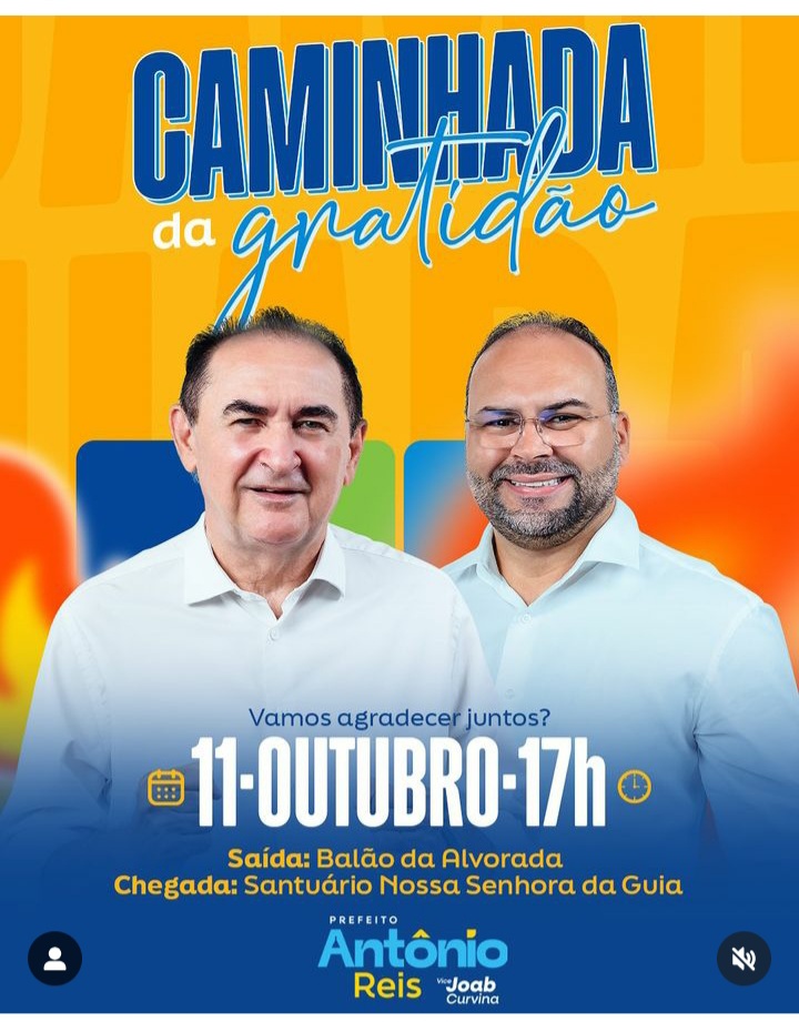 O prefeito reeleito de Floriano-PI, Antonio Reis e seu vice, Joab Curvina, realizam hoje a tradicional caminhada da gratidão, que é realizada há mais de 20 anos pelo seu grupo político em Floriano. A saída será às 17:00 hs do Balão da Alvorada com chegada no Santuário Nossa Senhora da Guia, em um percurso de cerca de 5 km. A coordenação pede que, se possível, camisas brancas , de preferência.