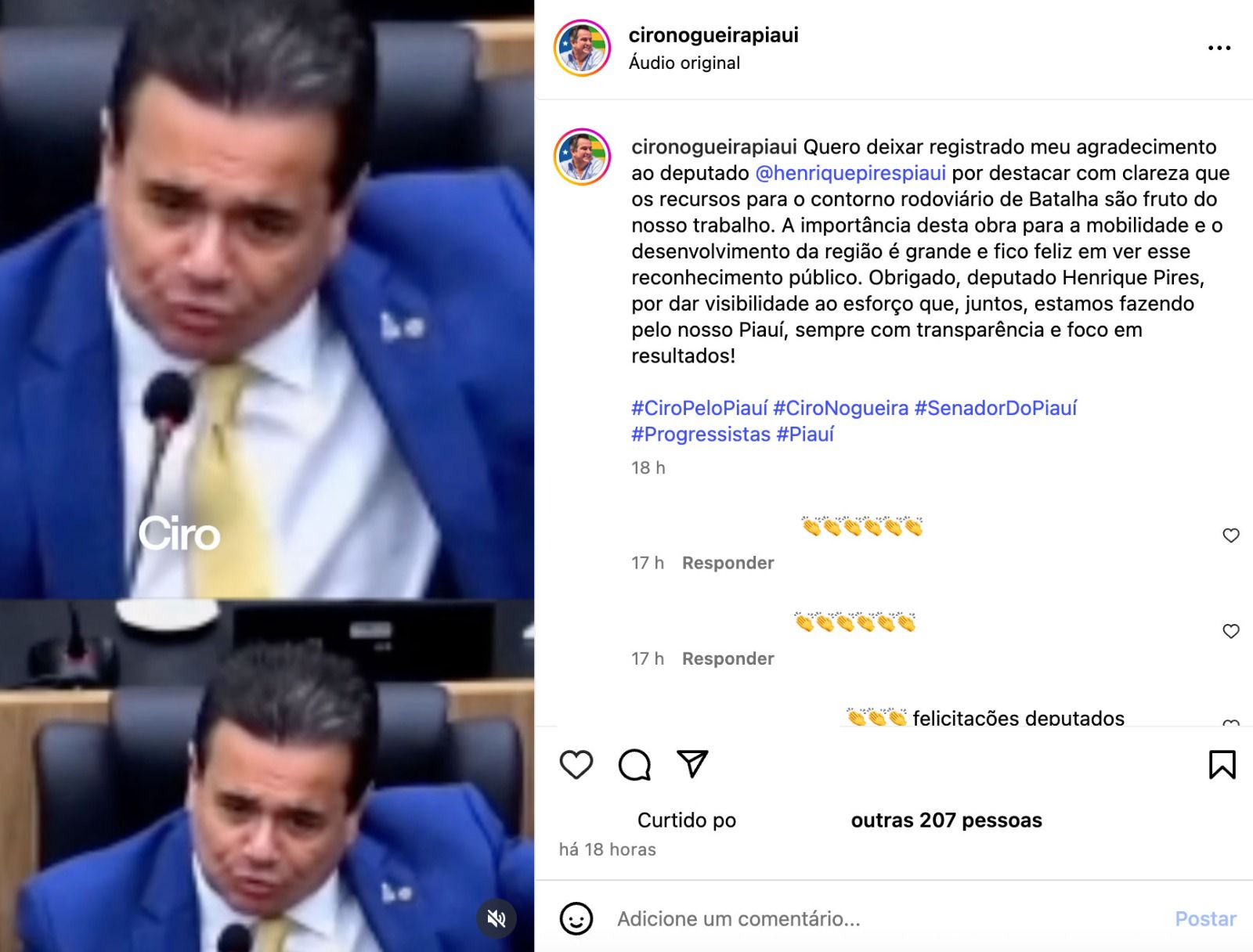 Ciro Nogueira agradeceu: “Quero deixar registrado meu agradecimento ao deputado Henrique Pires por destacar com clareza que os recursos para o contorno rodoviário de Batalha são fruto do nosso trabalho. A importância desta obra para a mobilidade e o desenvolvimento da região é grande e fico feliz em ver esse reconhecimento público. Obrigado, deputado Henrique Pires, por dar visibilidade ao esforço que, juntos, estamos fazendo pelo nosso Piauí, sempre com transparência e foco em resultados”.