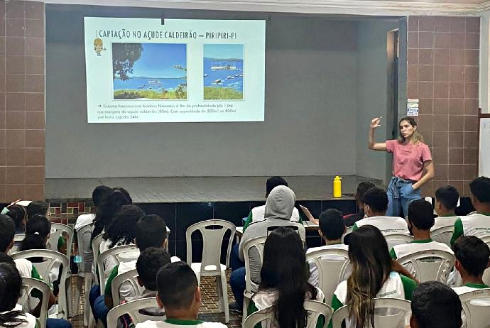 Uma palestra sobre o funcionamento do sistema de abastecimento de água levou conhecimento aos estudantes da escola Irmã Ângela. A assistente social Andressa Lustosa e engenheiro civil Pedro Mendes informaram as crianças a respeito de todo o caminho que a água percorre desde o sistema de captação até as torneiras das casas.